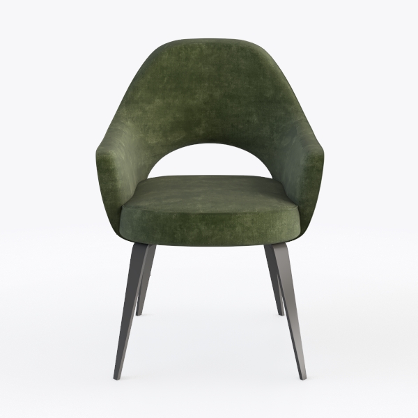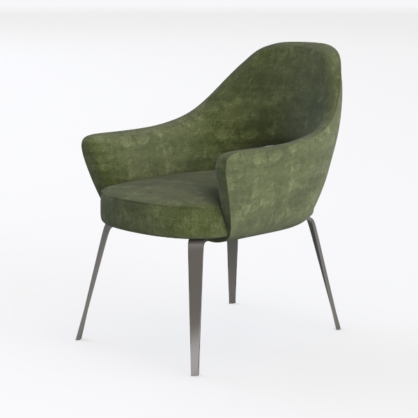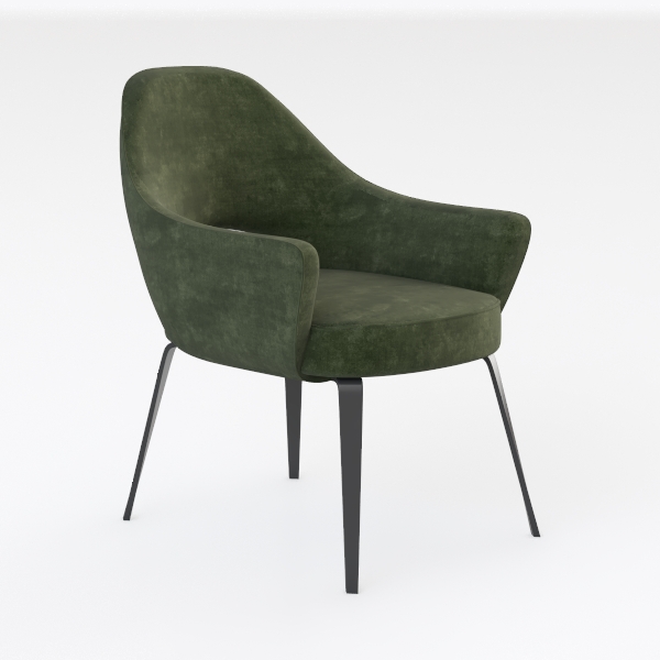 This elegant armchair merges organic design principles with modern simplicity, taking cues from the flowing lines of natural forms and mid-century furniture heritage. The seat is upholstered in a plush velvet fabric in a deep, sophisticated emerald green, its soft, matte texture inviting touch—warm and tactile, with subtle depth that catches light gently. The silhouette is defined by a curved backrest and armrests, which blend into a slightly sloped seat, creating a harmonious balance of softness and structural grace. The slender, tapering black metal legs add a contemporary contrast, ensuring lightweight stability while keeping the design airy.