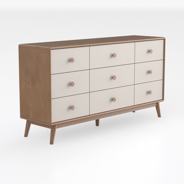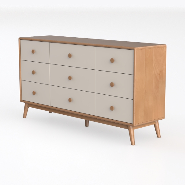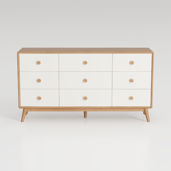 Functionality is key: six deep drawers provide ample room for organizing linens, accessories, or daily essentials, while the elevated legs ensure easy cleaning around the base. The small, round oak knobs on each drawer add a cohesive, intentional detail, and the light frame keeps the piece feeling airy rather than bulky. Overall, it’s a timeless, versatile piece that merges aesthetics with utility seamlessly.