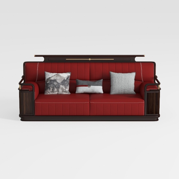 This stunning sofa is a perfect blend of contemporary elegance and classic charm, drawing inspiration from the art deco era. The rich, deep red upholstery exudes warmth and sophistication, while the meticulously crafted wooden armrests add a touch of timeless luxury. The cushions, adorned with subtle textures and varied patterns, invite you to experience both comfort and style, making it an ideal focal point in any living space.