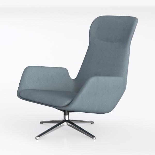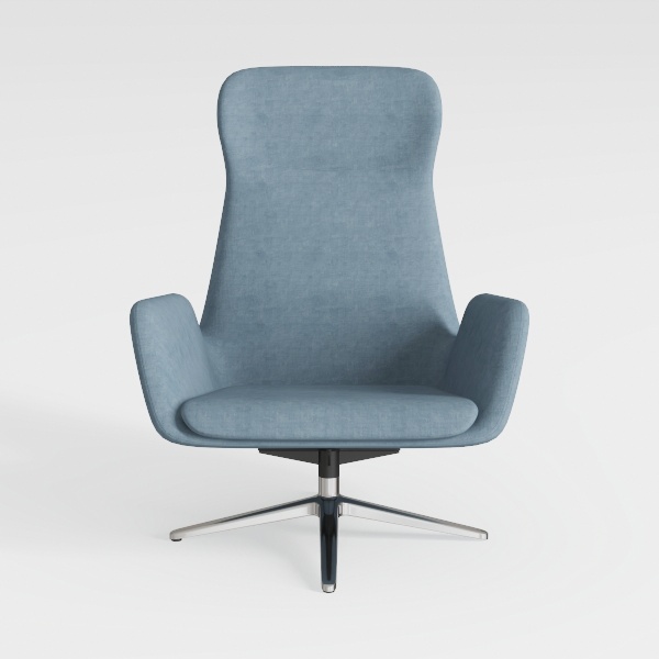 The upholstery, in a soft sky-blue hue, features a textured fabric that feels warm and inviting to the touch—light enough to feel airy yet dense enough to cradle the body. The high back and wide, plush seat cushion slope slightly, following the natural curve of the spine, ensuring exceptional support during extended periods of sitting or relaxing. Visually, the chair’s understated charm shines: its armrests flow seamlessly into the back, while the sleek, angular metal base with a matte black and polished silver finish adds a touch of modern sophistication, balancing the softness of the fabric.