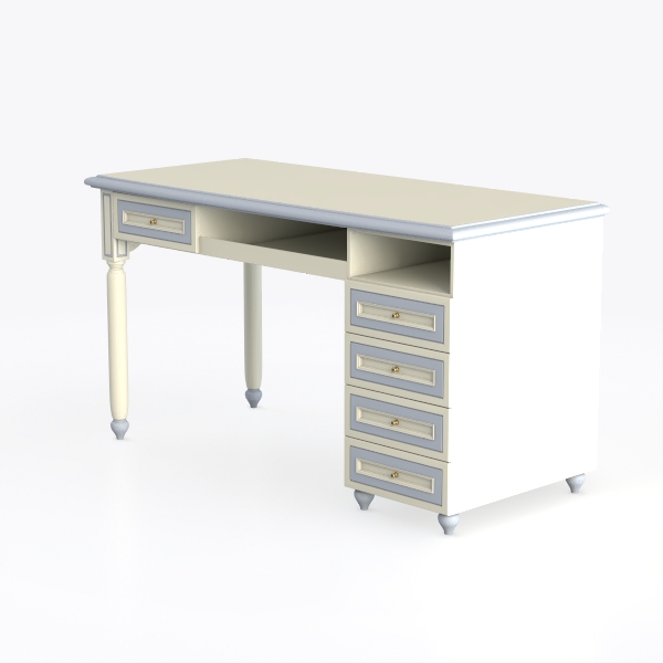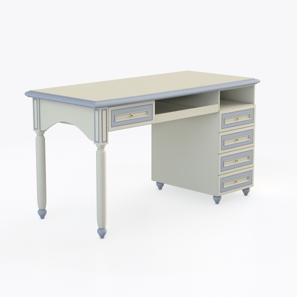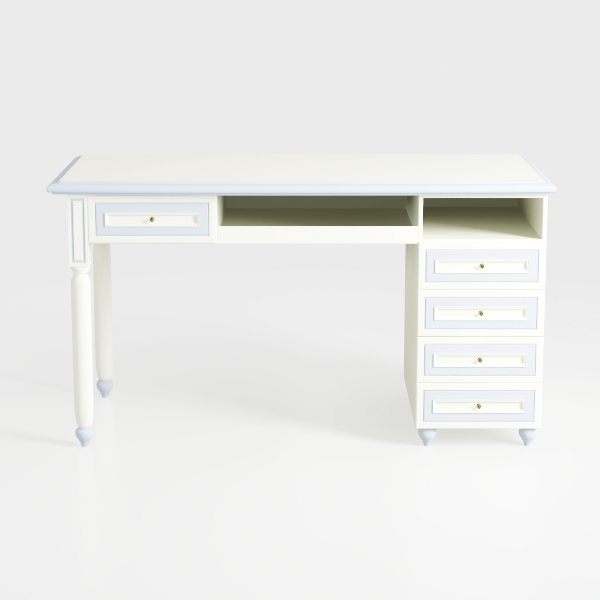 Visually, the main surface shimmers with a smooth, matte white finish, its soft texture catching light to create a warm glow. Delicate light blue accents trace the drawer fronts and tabletop border, adding a touch of softness that feels both intentional and effortless. Small, round brass pulls on the drawers glint faintly, balancing the piece’s understated nature, while the slender, tapered legs—tipped with the same light blue as the edges—lend a sense of lightness, making the desk feel airy rather than bulky.