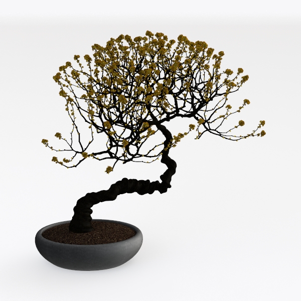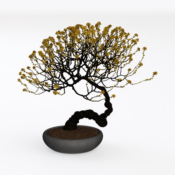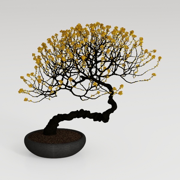 Inspired by the artistry of traditional East Asian penjing, this living piece blends natural growth with intentional design, mirroring the balance of wild and curated beauty. Its dark, sinuous branches—textured with subtle grain—twist and turn, forming a silhouette that feels both organic and purposeful. Delicate, golden blooms cluster along the stems, like scattered embers against the deep, earthy backdrop, adding a warm, lively contrast to the matte black of its stone vessel. The planter, a smooth, rounded bowl in a rich, dark hue, cradles the arrangement, its weight grounding the piece while the brown, granular soil peeks through the edges, evoking the hidden roots below.