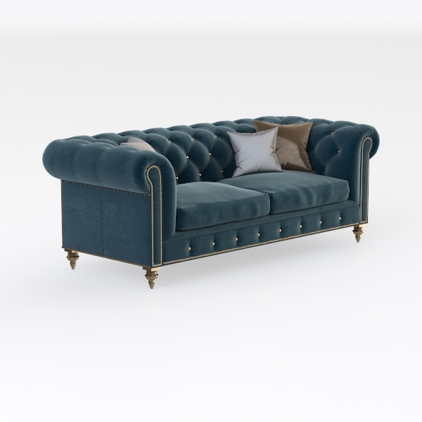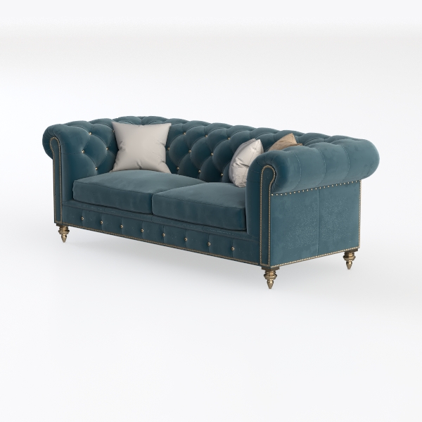 This luxurious sofa draws inspiration from classic British design, showcasing an elegant chesterfield silhouette. The rich, deep blue upholstery invites touch, boasting a soft, velvety texture that exudes comfort and sophistication. The intricate diamond tufting not only enhances its visual appeal but also provides a sense of opulence, while the subtle brass nailhead trim adds a refined touch.
