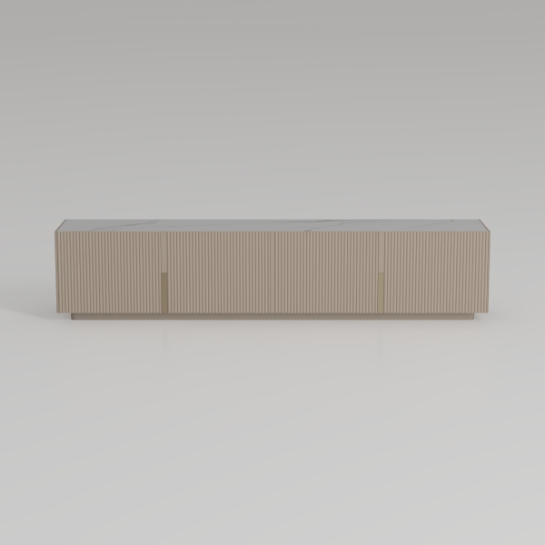 Ideal for modern minimalist, Scandinavian, or wabi-sabi-inspired living rooms, it pairs seamlessly with soft linen sofas, potted greenery, and marble coffee tables, enhancing the room’s airy, uncluttered feel. Its practical design includes four spacious cabinet doors with adjustable shelves, perfect for organizing media, books, or decor, while a low-profile base keeps the space open and allows easy access for under-cabinet storage, making it both functional and visually cohesive.