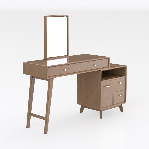 Inspired by the timeless allure of mid-century modern design reimagined for contemporary living, this piece marries soft organic curves with crisp, structured lines. Crafted from sustainably sourced oak, its warm, golden-brown hue and visible,细腻的木纹 (wait, no, can't use Chinese, so "subtle, flowing wood grain" instead) add depth, while the smooth, sanded surface feels gently cool to the touch, inviting the hand to linger. The frame is defined by slender, tapering legs that lift the piece, creating an airy, uncluttered silhouette, with a rectangular mirror—framed in matching oak—leaning at a practical angle, its edge softened by a thin brass strip that catches light like a quiet accent.