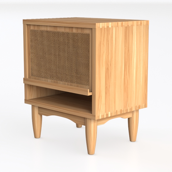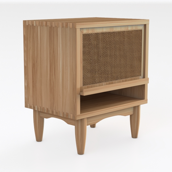 Drawing inspiration from traditional artisanal techniques and mid-century modern design, this piece merges organic textures with minimalist form, celebrating the beauty of natural materials. The frame, crafted from light oak wood, showcases soft, visible grain patterns that add warmth and authenticity, while the front is adorned with a handwoven rattan panel—its intricate grid design creating a tactile, breathable contrast to the smooth wood. The overall visual is light and airy, avoiding heaviness, with the rattan’s natural beige hue complementing the wood’s warm golden tones, evoking a sense of calm and connection to nature.