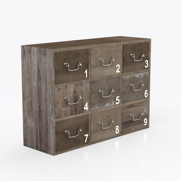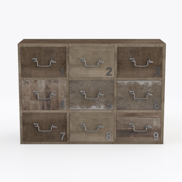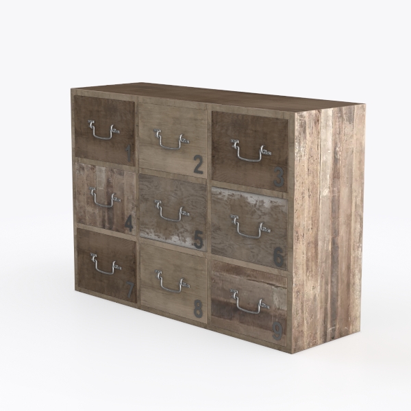 Visually, it strikes a balance between ruggedness and refinement: the uneven wood finishes create a tactile, almost tactilely satisfying feel, while the numbered drawers (1-9) add a whimsical, organized touch. The overall aesthetic is inviting yet purposeful, with the varying wood tones breaking up the monotony and making each drawer feel distinct.