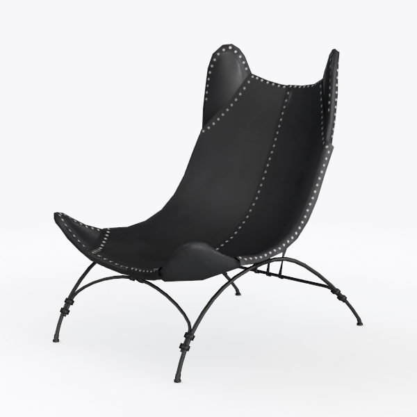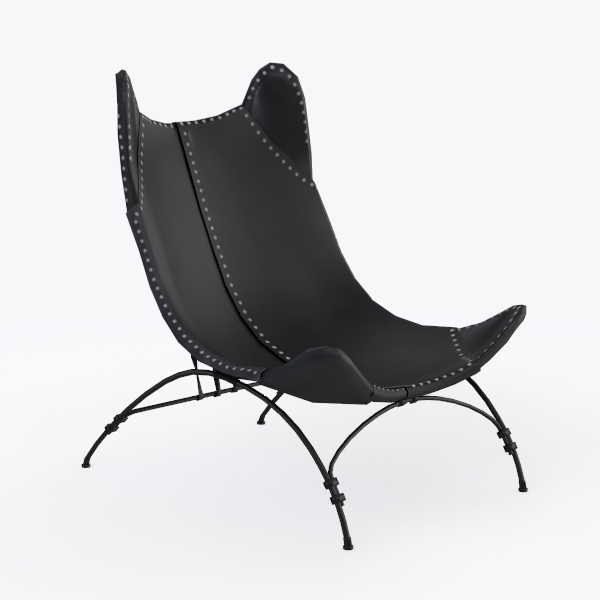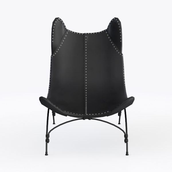 Crafted with smooth, high-quality black leather, the surface offers a cool, supple touch—cool to the hand yet yielding to the body, while subtle grain patterns add depth without sacrificing simplicity. The leather is neatly stitched, with delicate, evenly spaced metal studs tracing the edges of the wide, curved backrest and armrests, introducing a touch of industrial charm that contrasts beautifully with the sleek, matte black metal frame.