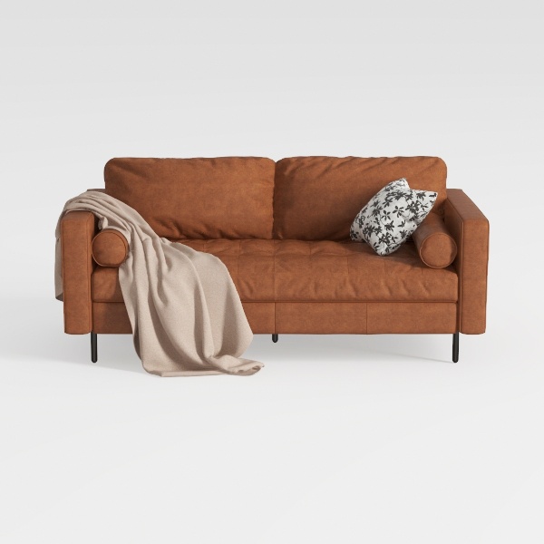 Inspired by the warmth of natural elements, this contemporary sofa combines rustic charm with modern aesthetics. The rich, earthy tones of the upholstery evoke a cozy atmosphere, while the soft, velvety texture invites you to sink in and relax. Paired with a light beige throw and a patterned accent pillow, this piece is designed to be both stylish and inviting.
