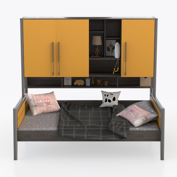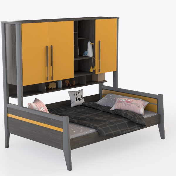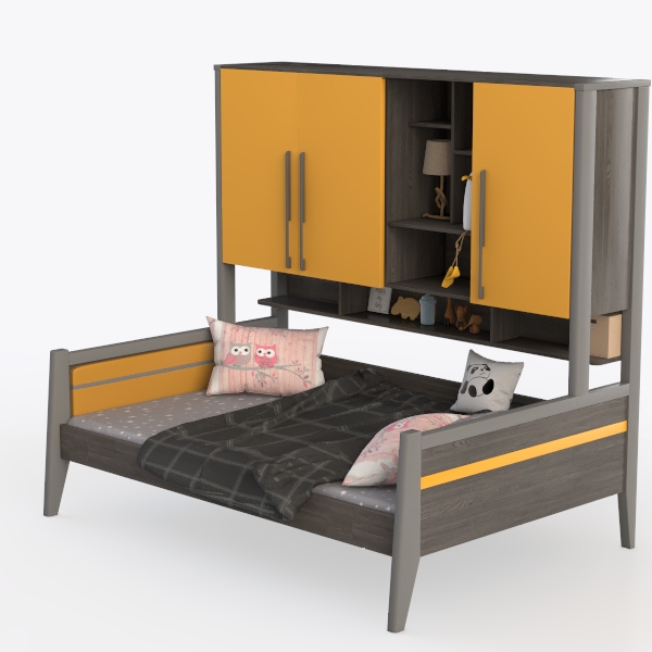 Inspired by the joy of childhood exploration and the need for organized, growing spaces, this bed merges playful charm with practical design. The frame, in a soft matte gray, feels warm and sturdy, its smooth surface inviting gentle touches. Above the bed, vibrant yellow cabinet doors—with a slightly textured finish that catches light—add a lively contrast, while sleek metallic handles provide a modern, easy-grip. The open shelves hold small treasures like storybooks and plush toys, blending display and storage, while closed cabinets tuck away clothes or bed linens neatly.