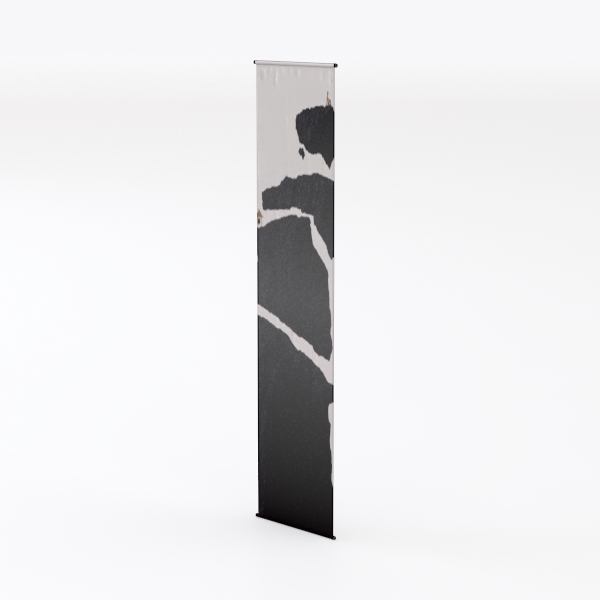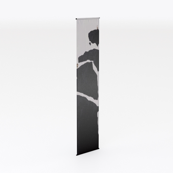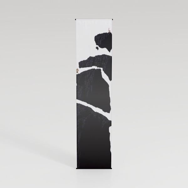 This design takes cues from the dramatic, layered textures of natural landscapes—think the weathered edges of coastal cliffs or the stark contrasts of mountain shadows. The monochromatic pattern, rendered in deep blacks and crisp whites, mimics the raw, organic beauty of stone formations, while the vertical orientation adds a sense of height and flow.