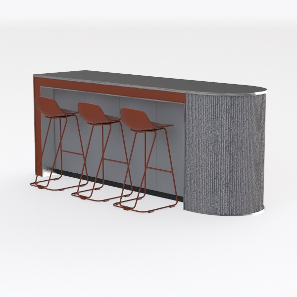 Visually, the design balances simplicity with detail: the matte, slightly granular texture of the gray body invites close interaction, while the metallic top reflects ambient light, elevating the space with a subtle sheen. The three curved red bar stools, with their thin, angular metal legs, complement this balance—their warm, earthy hue popping against the neutral base, creating a dynamic contrast that feels both intentional and effortless.
