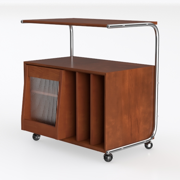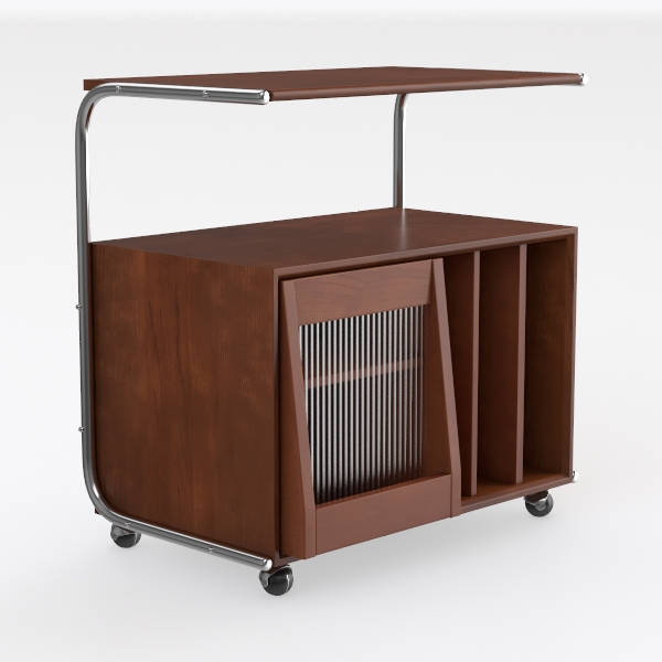 This elegant, multi-functional cart draws inspiration from mid-century modern design principles, blending practicality with subtle sophistication. Its warm, richly grained wooden surface—likely a cherry or walnut finish—boasts a smooth, tactile texture that feels both natural and grounded, while the sleek, brushed stainless steel frame adds a modern contrast, balancing the organic warmth of the wood with a cool, industrial edge. The clean, uncluttered lines of the structure, with a slightly overhanging top shelf and open lower compartments, create a balanced, visually light feel, making it a versatile piece that doesn’t overwhelm small spaces.