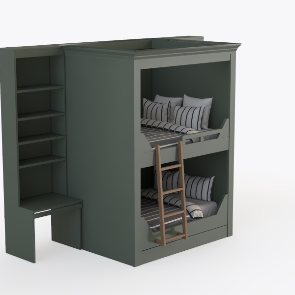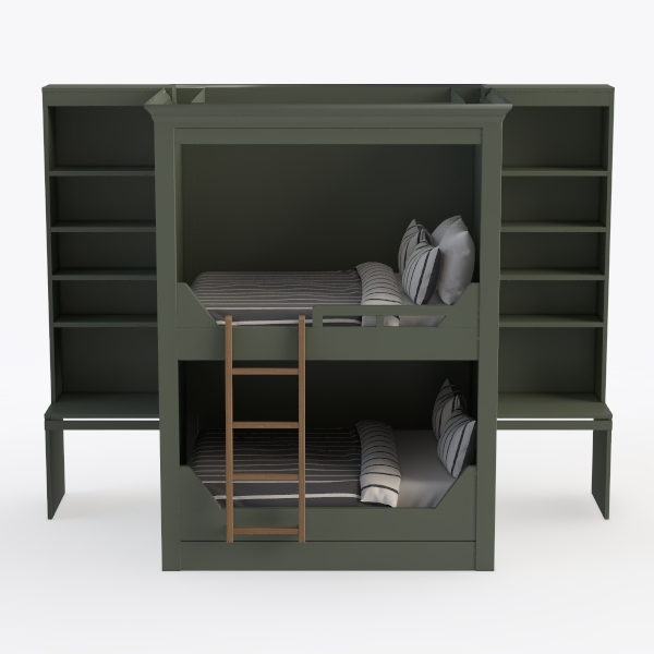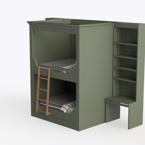 This piece takes cues from the demand for multi-functional family spaces, merging sleeping and storage into a streamlined, cohesive design. The deep, muted olive-green wooden frame radiates a grounded, earthy charm, with smooth, matte-finished surfaces that feel warm and inviting to the touch. The integrated bookshelves flanking the bed add both visual depth and practicality—their clean, straight lines harmonizing with the bed’s structured form, while the vertical wooden ladder connecting the two levels introduces a subtle, functional accent. The striped linen bedding and soft, plump pillows introduce gentle textural contrast, balancing the frame’s solidity with a cozy, lived-in feel.
