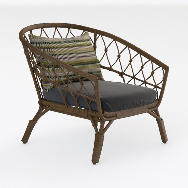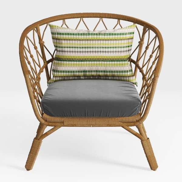 Beneath the armrests, a plush, charcoal-gray cushion invites relaxation, its soft, velvety fabric offering a tactile contrast to the rattan’s firmness. The included striped pillow, adorned with alternating green and cream geometric lines, adds a pop of color and visual rhythm, enhancing the piece’s playful yet grounded vibe.