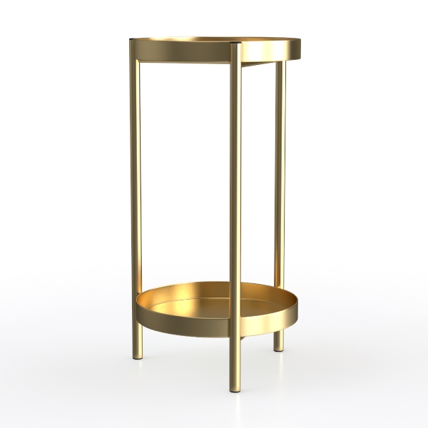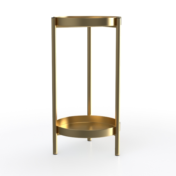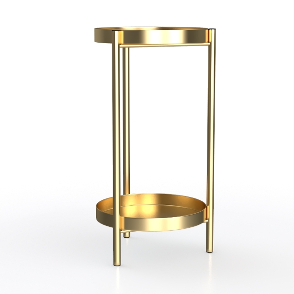 Inspired by mid-century modern minimalism with a touch of vintage opulence, this golden side table features sleek, polished metal. Its smooth, reflective surface exudes elegant warmth, while slender legs and two-tiered design add lightness. Ideal for modern minimalist living rooms, pair it with marble coffee tables and metallic floor lamps. The dual tiers offer space for decor, books, or refreshments, blending style and functionality seamlessly.