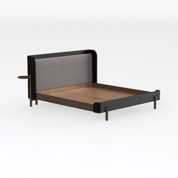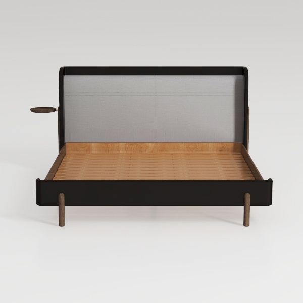 Inspired by mid-century modern minimalism, this bed blends a sleek black frame with soft gray upholstery, while warm oak slats add natural texture. Perfect for a serene bedroom, pair it with marble nightstands and linen bedding. Sturdy wooden slats ensure breathability, and the low-profile design creates a spacious, cozy feel for restful nights.