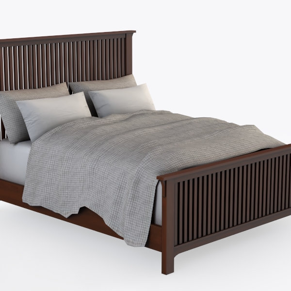 Inspired by natural vertical lines, this bed features a warm, dark wood frame with clean, slatted headboard and footboard, evoking Scandinavian minimalism. The wood’s smooth, matte finish offers tactile warmth, vertical slats create an airy silhouette, paired with soft gray checkered bedding for gentle texture. Ideal for modern minimalist or Scandinavian bedrooms, it complements light walls, wooden floors, and linen cushions, ensuring steady support for restful nights.