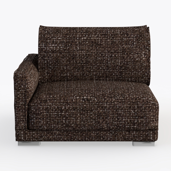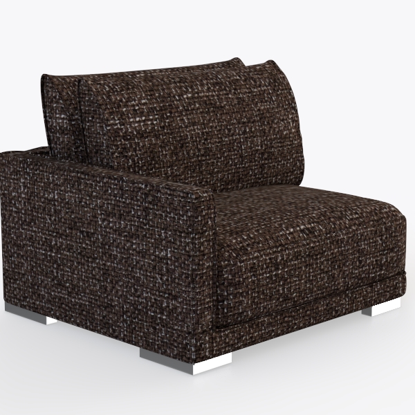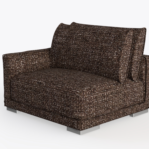 This armchair takes cues from the timeless allure of natural materials, merging warm, earthy charm with modern simplicity. Its surface features a rich, textured weave in deep browns and subtle cream accents, where each thread variation creates a soft, inviting tactile experience—smooth to the touch yet surprisingly resilient, making it both comforting and long-lasting. The interplay of light across the fabric adds depth, giving the piece a warm, lived-in look that feels grounded yet fresh.