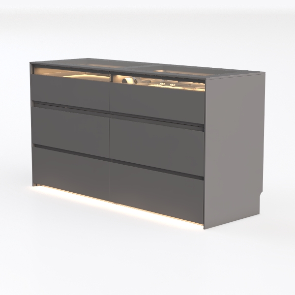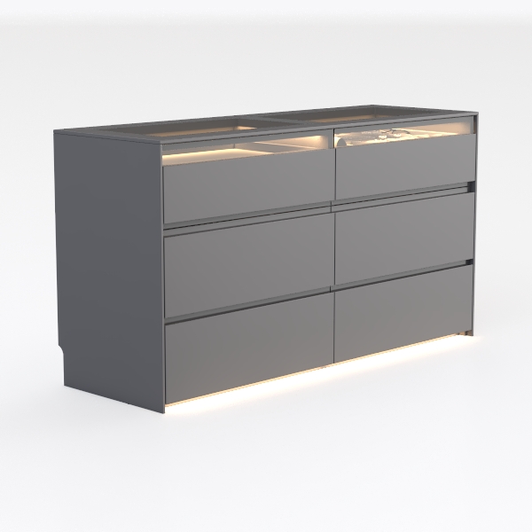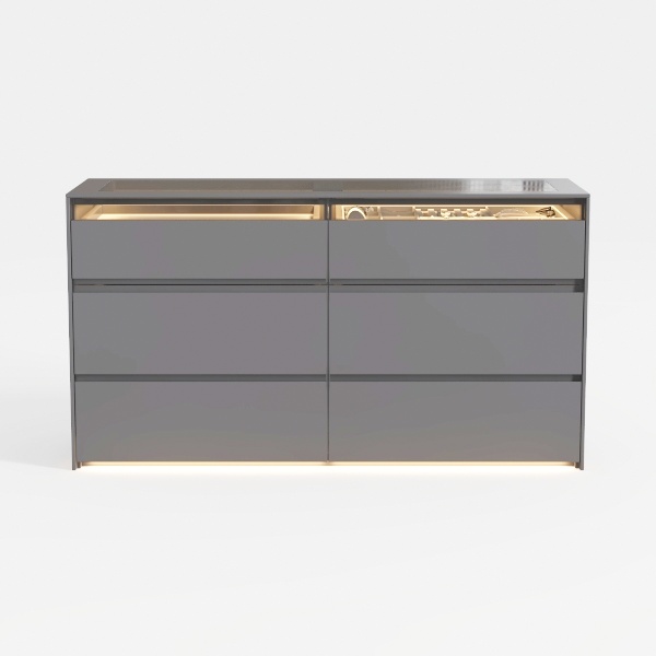 Inspired by minimalist design, this sleek cabinet features a smooth matte gray surface, with built-in LED lighting along the base and drawer fronts, casting a warm, layered glow. Ideal for modern, contemporary living or bedrooms, it pairs beautifully with wood tones and metal accents. Six spacious drawers offer easy-glide access, blending functionality with understated elegance.