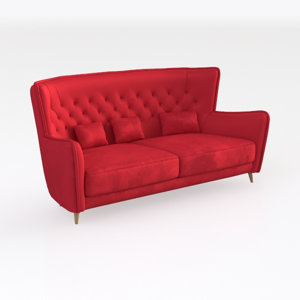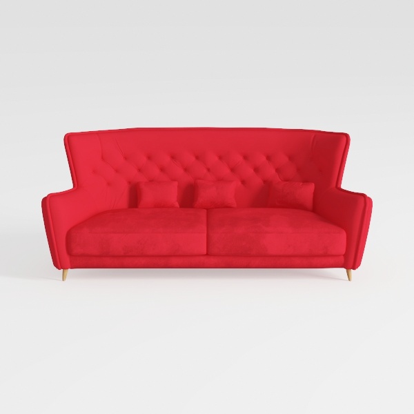 The star feature is its sumptuously soft, velvety red upholstery: running a hand over its surface reveals a rich, buttery texture that catches light subtly, casting a warm, inviting glow. The tufted detailing along the back adds intentional depth, while gently curved armrests soften the silhouette, making the sofa feel both structured and cozy. Its slim, gold-tone legs elevate the design, balancing the plushness of the fabric with a touch of refined elegance, ensuring it feels grounded yet light on its feet.