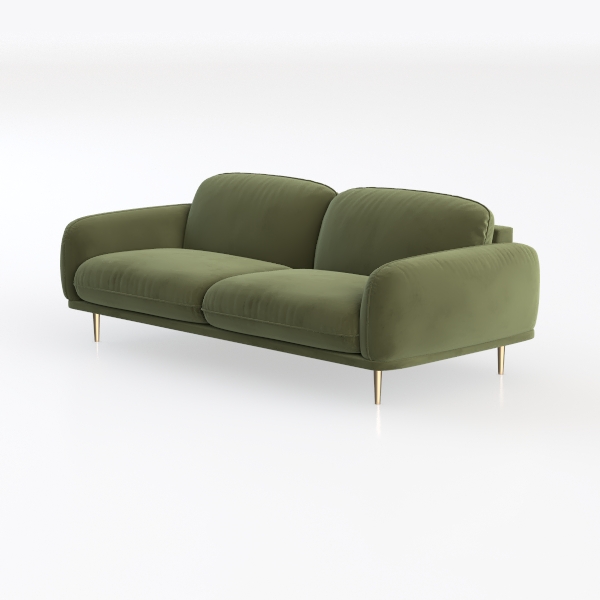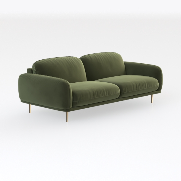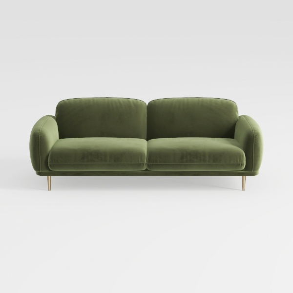 This elegant sofa draws inspiration from organic, flowing forms, blending the softness of natural curves with a touch of mid-century modern charm. Its rich olive-green upholstery, with a subtle velvet-like texture, feels luxuriously smooth to the touch, inviting you to sink in and relax. The rounded armrests and gently sloped backrest create a warm, approachable silhouette, while the slim, gold-tone metal legs add a delicate, elevated finish, keeping the piece visually light and uncluttered.