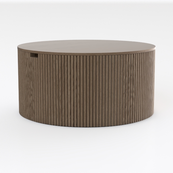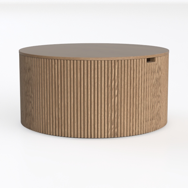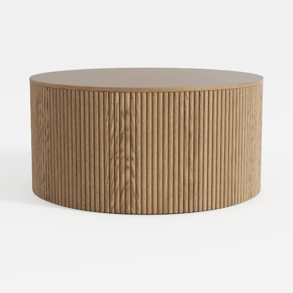 Inspired by natural tree bark textures, this round wooden table has a warm, smooth oak surface with subtle vertical ridges creating depth. Its soft, earthy tone adds a cozy, minimalist vibe. Ideal for modern or Scandinavian living rooms, it pairs beautifully with neutral sofas and potted plants, while the spacious top offers ample space for drinks and decor.