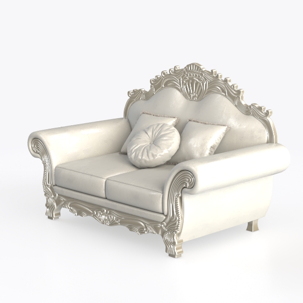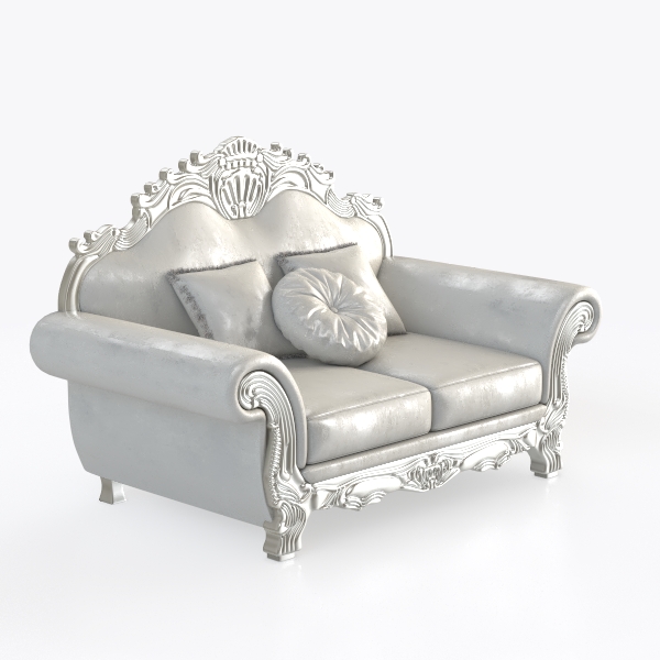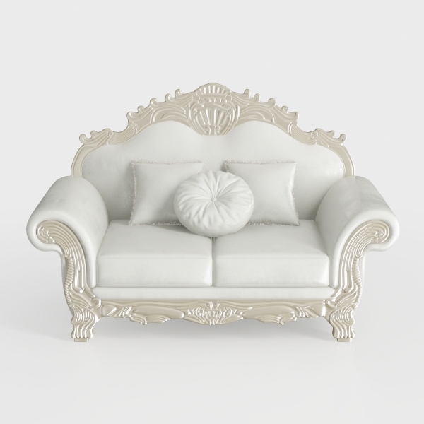Crafted with meticulous attention to texture, the sofa features a smooth, high-quality upholstery in a crisp white hue that reflects light beautifully, creating an airy, luminous feel in any space. The upholstery itself is surprisingly tactile—cool and velvety to the touch, with a subtle sheen that enhances its luxurious look. The carved wooden frame, finished with a warm, metallic undertone, adds depth, with each curve and detail meticulously shaped to feel both sturdy and inviting.