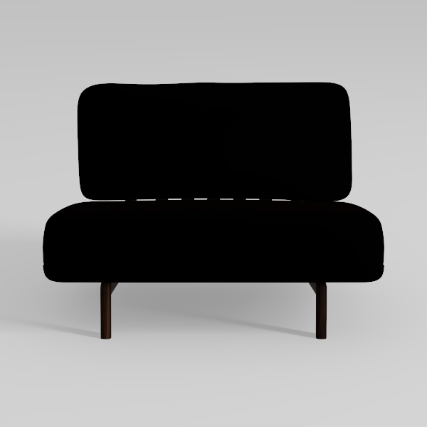 The star of the show is the deep black upholstery, which wraps the seat and back in a velvety, tactile fabric. Running a hand over its smooth surface reveals a soft, almost buttery texture, while the slight sheen adds a subtle opulence that elevates the design. This rich hue contrasts striking with the sofa’s slender, dark wooden legs, which are positioned to frame the piece, giving it a light, grounded presence rather than a heavy one.