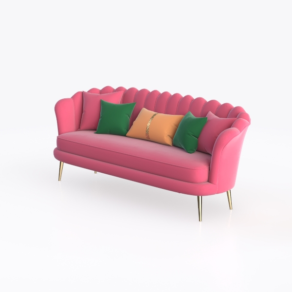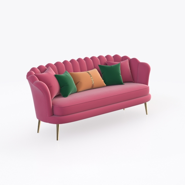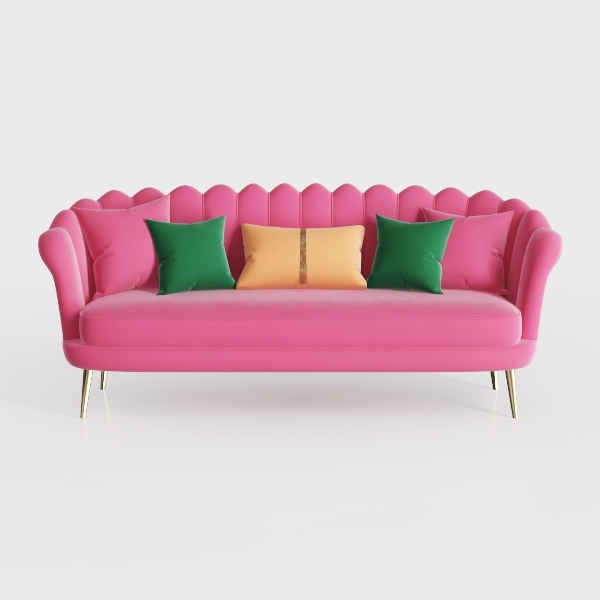 This eye-catching sofa blends the soft, organic curves of mid-century modern design with a playful, contemporary twist. Its backrest, shaped like gently undulating waves, evokes a sense of fluid movement, while the vibrant bubblegum-pink upholstery adds a cheerful pop of color that feels both bold and inviting.