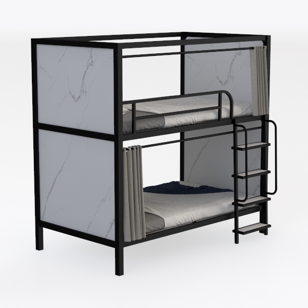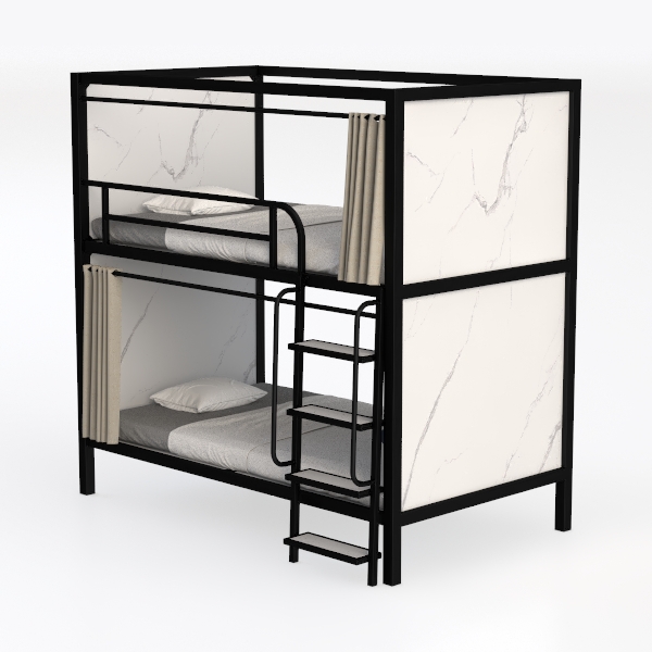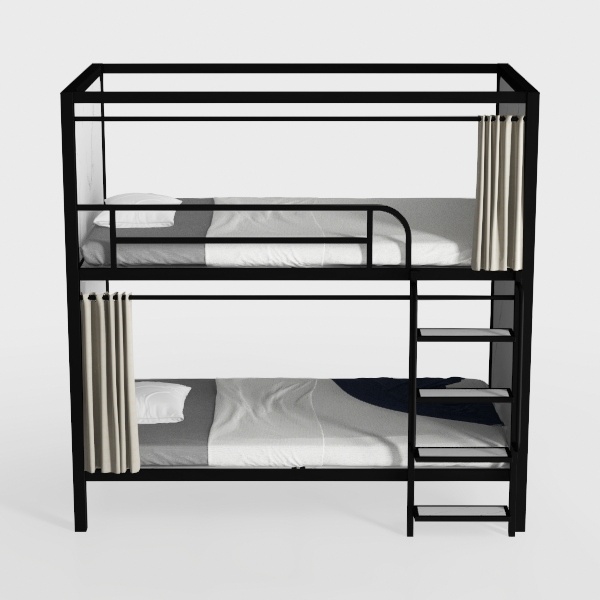Inspired by space-efficient industrial minimalism, this bunk bed blends sleek lines with practicality. The black metal frame offers a cool, smooth touch, while soft, neutral linens add warmth, creating a clean, uncluttered look. Perfect for kids' rooms, dorms, or compact spaces, it pairs beautifully with wooden floors and metal accents. A sturdy ladder and spacious underbunk area ensure easy access and extra storage, balancing style and utility.