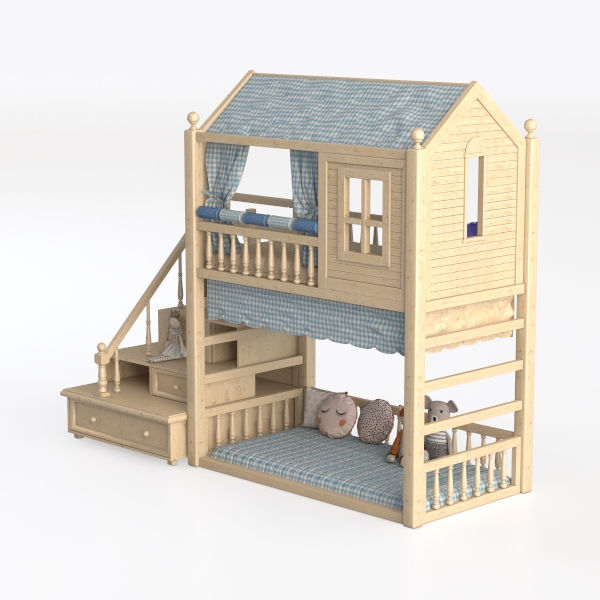 This charming bunk bed, inspired by whimsical cabin designs, features warm wooden texture that feels smooth to the touch. Soft blue gingham fabric on the roof and curtains adds a cozy vibe, complemented by cute stuffed toys for a playful look. Ideal for a nursery or kids' room, it pairs well with soft pastels and cottage-style decor. Built-in staircase with storage drawers enhances practicality, making it both functional and inviting for little ones.