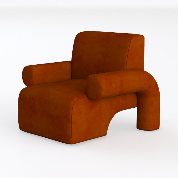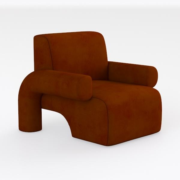 This armchair merges mid-century modern warmth with contemporary minimalism, drawing inspiration from the organic curves of vintage furniture reimagined for today’s spaces. Its rich terracotta hue, like a warm sunset glow, casts a cozy, inviting light across a room, while the soft, velvety upholstery feels incredibly plush to the touch—sinking into it is like embracing a cloud, with a texture that balances softness and subtle depth.