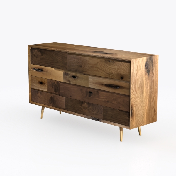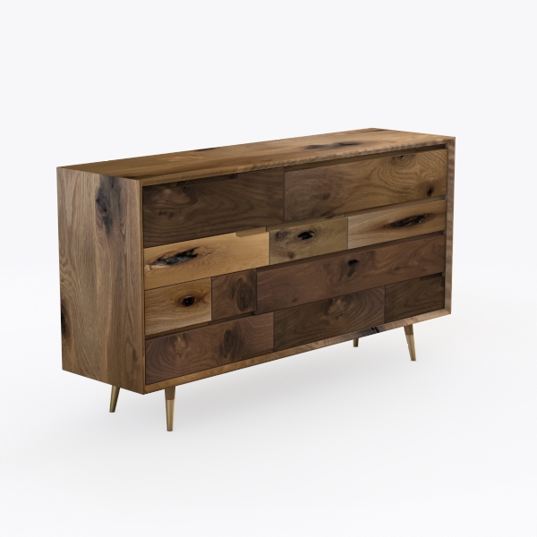 Inspired by organic wood grains, this piece blends warm, earthy tones with smooth, tactile surfaces. Distinct drawer patterns create visual rhythm, while rich polished wood feels sturdy and inviting. Ideal for minimalist cozy living/bedroom, pairs with soft textiles and understated decor. Spacious drawers offer storage; slender golden legs add subtle elegance, balancing function and style.