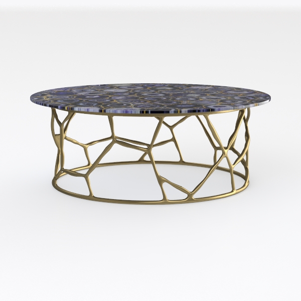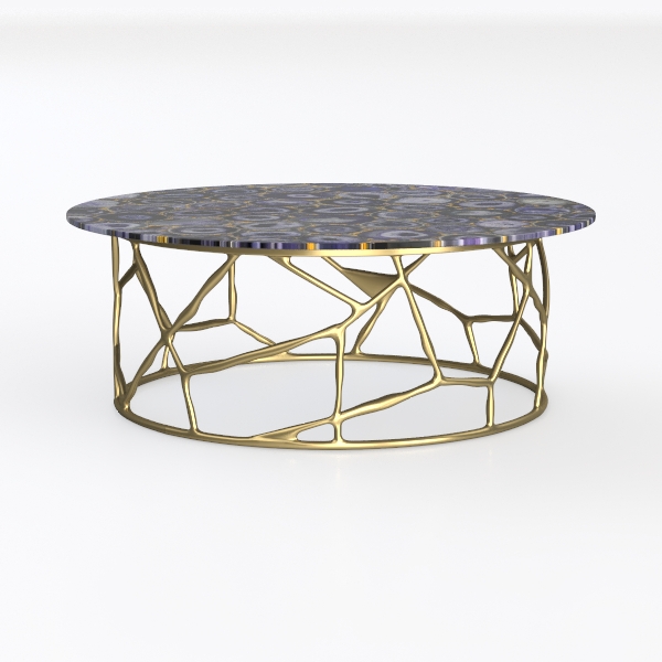 Inspired by natural gemstone patterns and organic tree branch structures, this table has a smooth, glossy marble-like surface with intricate concentric gemstone patterns creating depth. Its matte gold metal base, with branching, organic frames, adds warm, sculptural contrast—ideal for modern luxury living rooms, pairing with velvet sofas and geometric rugs. The stable, open frame ensures sturdiness, while the round top offers ample space, balancing style and practicality.