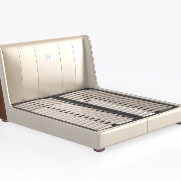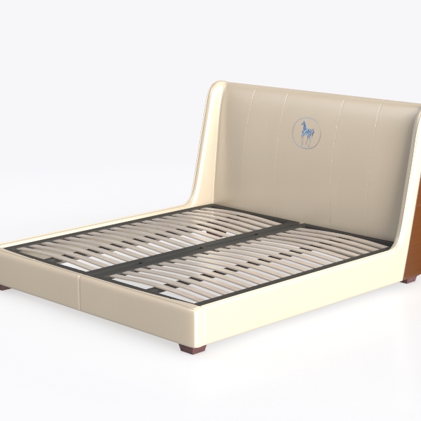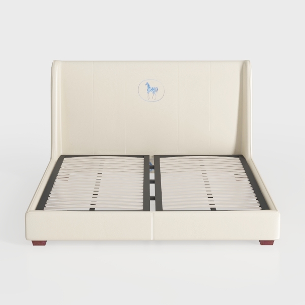 Design inspiration blends soft artistry and natural calm, with the smooth, creamy leather headboard—soft, warm tones, fine texture, and a delicate blue horse motif—exuding serenity. Ideal for modern minimalist or Scandinavian bedrooms, pairing beautifully with light wooden furniture and soft linen. Sturdy slatted base ensures excellent support; gently curved headboard offers comfortable backrest for relaxing moments.