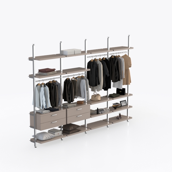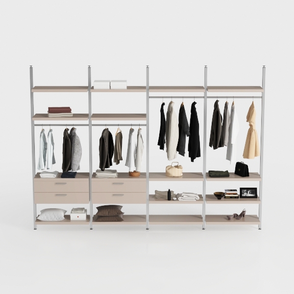 Inspired by minimalist and industrial aesthetics, this wardrobe features clean lines, matte metal frames, and warm wooden shelves, blending sleek modernity with cozy warmth. Ideal for a contemporary bedroom, it pairs beautifully with soft textiles and metallic accents. Spacious drawers and hanging rods offer ample storage, while lower shelves display curated decor, balancing functionality and style.