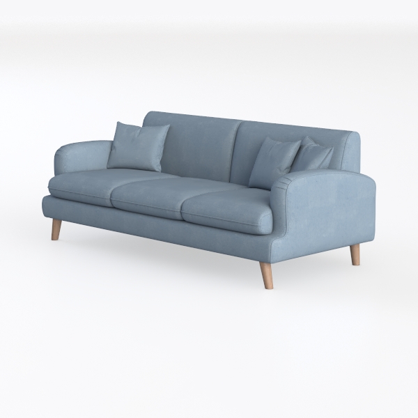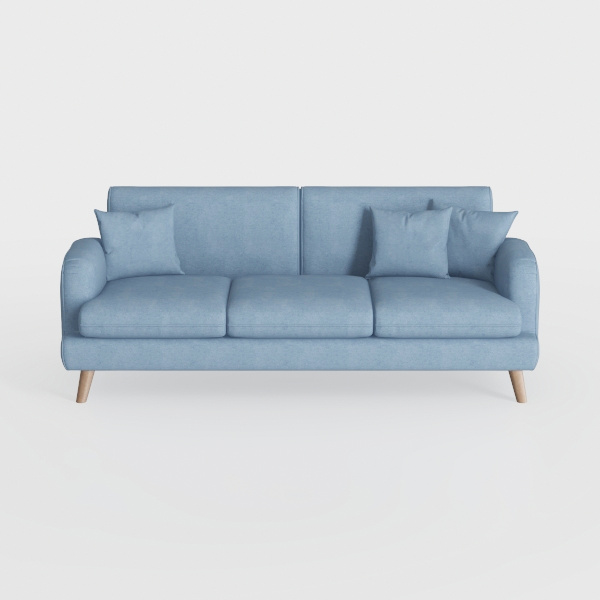 This elegant three-seater sofa draws inspiration from coastal calm, with its soft, muted blue upholstery evoking the gentle glow of a clear sky or the quiet of a sunlit beach. The textured linen blend fabric feels warm and inviting to the touch, its subtle weave catching light to create a soft, diffused shimmer that lightens the space. The design balances simplicity and comfort, with a streamlined silhouette and tapered wooden legs that add a touch of natural warmth, grounding the piece without overwhelming the room.