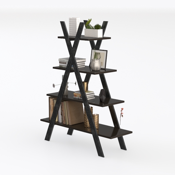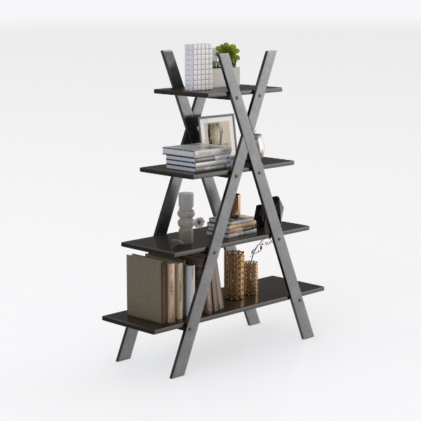 Designed with geometric minimalism, this multi-tiered shelf blends industrial edge with modern simplicity. Its sleek black metal X-frame contrasts with smooth dark wood shelves, creating a striking mix of textures—cool metal and warm wood that feels sturdy yet elegant. Ideal for modern industrial or minimalist living rooms, it pairs with marble accents and soft lighting, showcasing books, potted plants, and decor. Staggered shelves offer ample storage, while the stable frame ensures durability, balancing function and style.