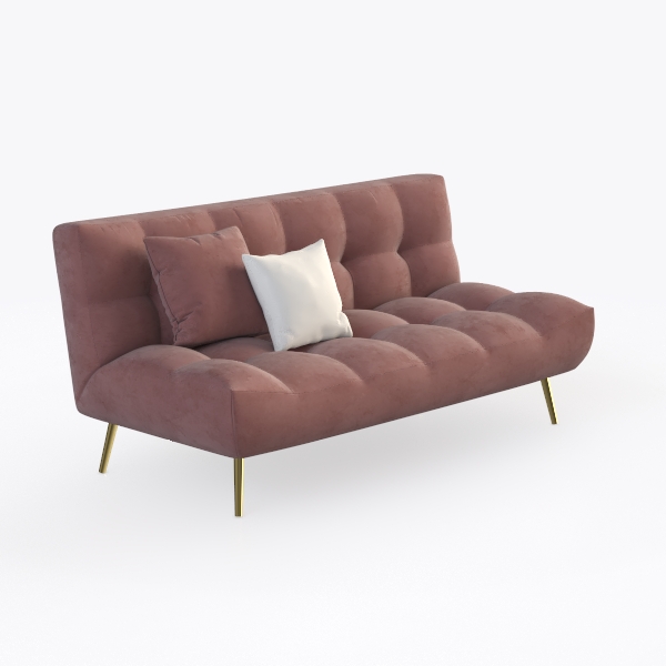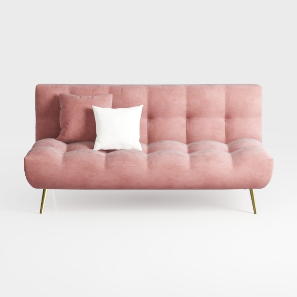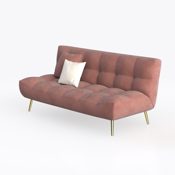 This elegant sofa, with its soft blush hue and timeless design, draws inspiration from the blend of mid-century charm and contemporary minimalism. Its plush, velvety upholstery feels surprisingly lightweight to the touch, inviting you to sink in and unwind, while the intricate tufted pattern creates subtle, inviting texture that catches light gently—adding depth without overwhelming the eye. The slender gold legs, polished to a warm sheen, lift the piece slightly, balancing its softness with a delicate, upscale lift that feels both modern and refined.