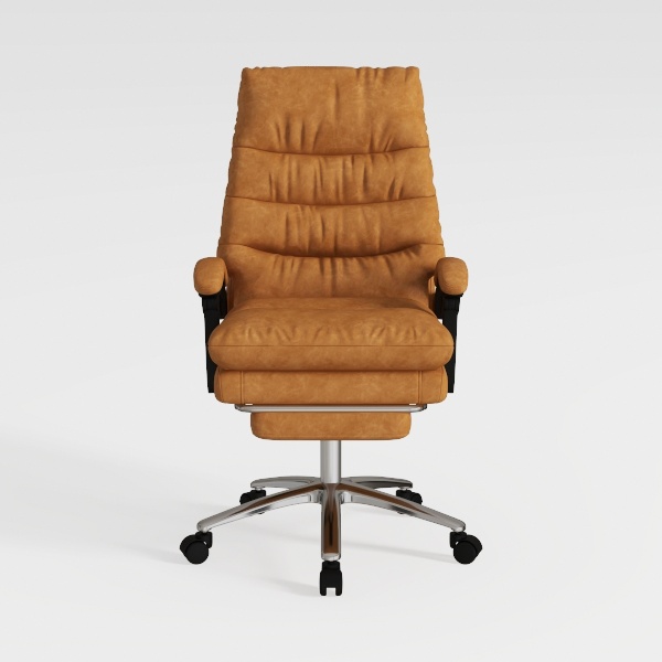 Designed with ergonomic principles, blending modern aesthetics and comfort. The warm brown upholstery, with soft tufted details, offers a tactile mix of luxury and approachability, while black armrests and a polished metal base add contemporary flair. Ideal for home offices or minimalist living spaces, it pairs well with wooden desks or marble side tables. The padded backrest and extendable footrest ensure all-day comfort, with smooth-rolling casters for easy mobility.