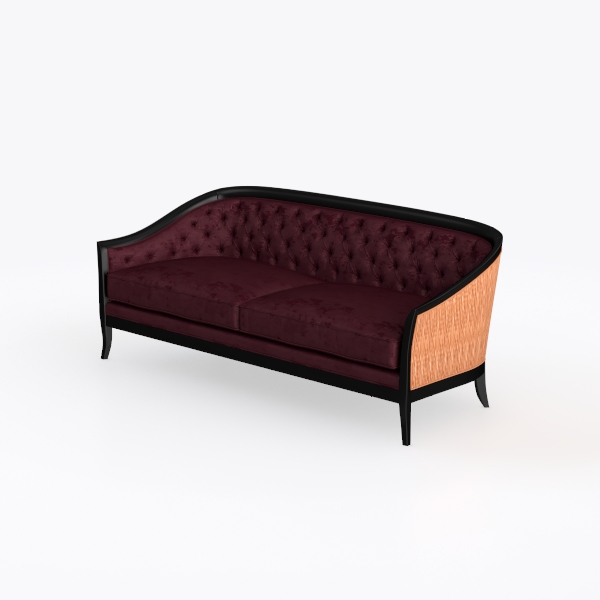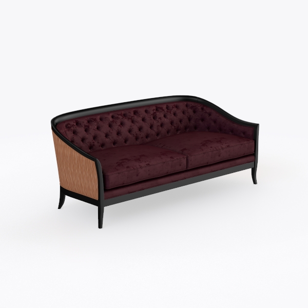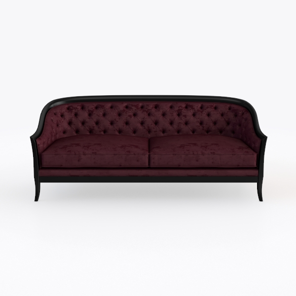 Inspired by the timeless allure of mid-century modern design, this sofa blends classic craftsmanship with contemporary elegance. Its deep burgundy velvet upholstery feels sumptuously soft to the touch, with artfully placed tufted buttons creating subtle texture that catches light, adding depth to the rich, warm hue. The sleek black wooden frame, with gently curved arms and a low-profile back, contrasts beautifully with the fabric, enhancing the piece’s sophisticated silhouette.
