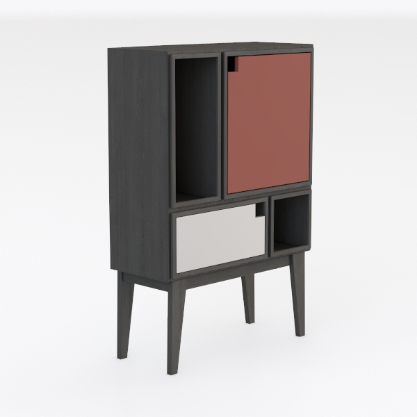 Inspired by geometric art and minimalist architecture, this storage unit features a sleek matte deep gray frame with terracotta, white, and black accents. Smooth to the touch, its clean lines and balanced compartments create visual rhythm, ideal for modern, Scandinavian, or mid-century spaces. Pair with light wood tables and soft rugs, offering versatile storage for books, decor, or daily items—sturdy yet lightweight on slim legs.