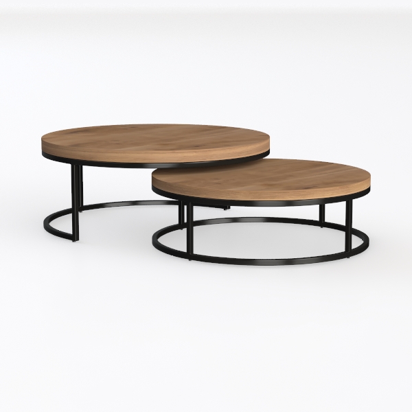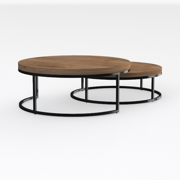 Inspired by the blend of natural wood warmth and industrial metal sleekness, this nested coffee table set features warm, textured wooden tops and thin black metal frames, creating a balanced visual appeal. Perfect for modern minimalist or industrial living rooms, it pairs beautifully with soft sofas and neutral rugs, while two nested circles save space and offer versatile surfaces for drinks, books, or decor, ensuring style and practicality.