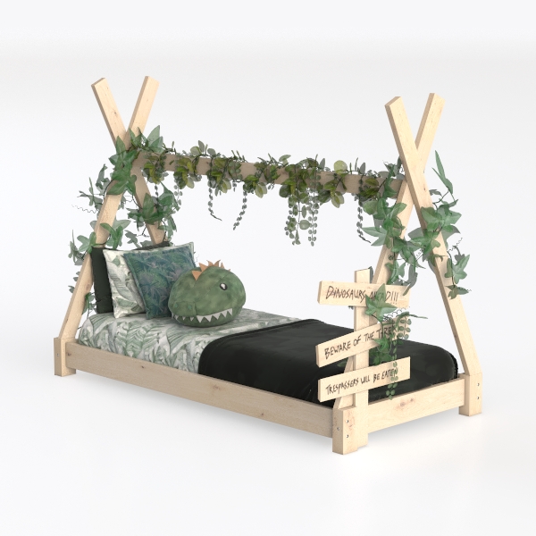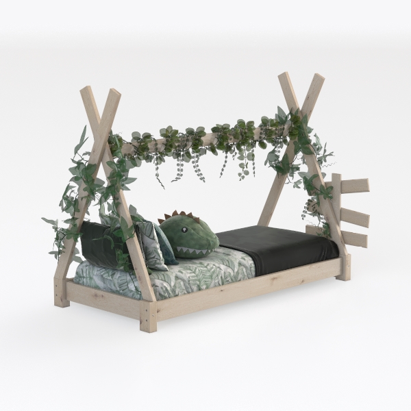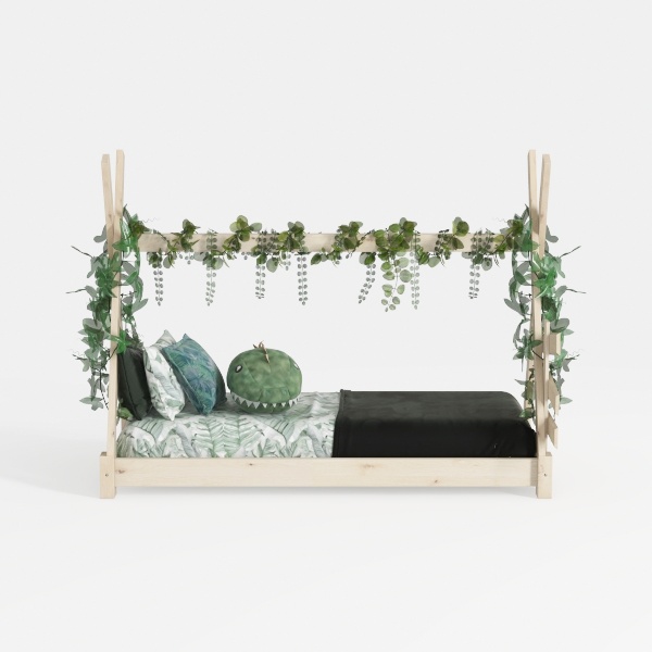 Inspired by forest canopies, this bed blends soft wooden frames with trailing greenery, evoking a natural, earthy vibe. Smooth wood and lush vines offer a tactile, organic feel, while the leaf-patterned bedspread adds subtle texture, keeping the space light and inviting. Ideal for a kids' room, it pairs with minimalist wooden furniture and soft, natural decor, enhancing a cozy, nature-inspired atmosphere. Sturdy yet lightweight, the frame ensures stability, and the open design ensures easy movement, prioritizing safety and comfort for little ones.