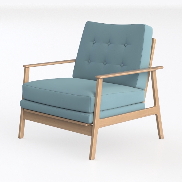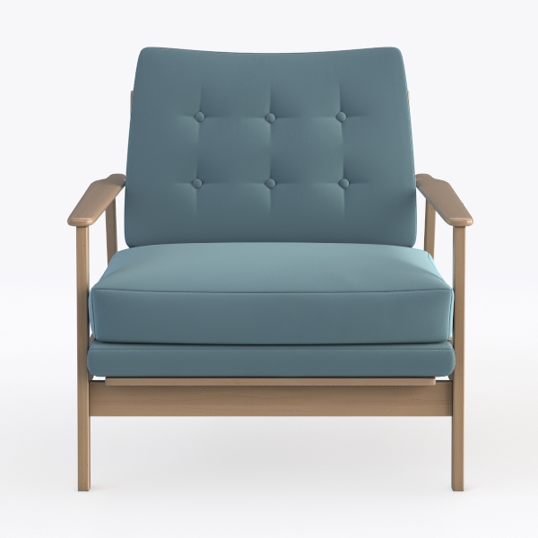 Crafted with mid-century modern charm, this armchair blends timeless elegance with contemporary comfort. Its soft, light blue upholstery features subtle button tufting, adding texture, while the warm wooden frame exudes natural warmth. Ideal for a sleek living space, it pairs effortlessly with marble surfaces and metallic accents. A generous seat depth ensures ultimate coziness, making it perfect for unwinding after a long day.