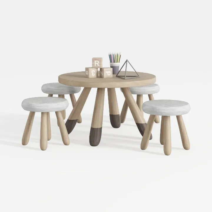 Inspired by nature and childhood joy, this set blends warm wood tones with soft gray seats. The smooth wooden legs, with natural grain, contrast gently against the plush, comfortable upholstery, creating a visually gentle, safe vibe. Perfect for a child’s room or family play area, it fits a Scandinavian or minimalist style, complemented by soft lighting and colorful toys. Sturdy yet lightweight, the rounded edges ensure safety, while the roomy seats offer a cozy spot for play, reading, or crafting.