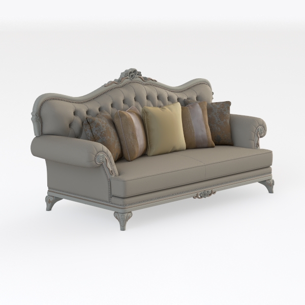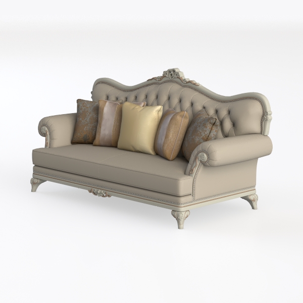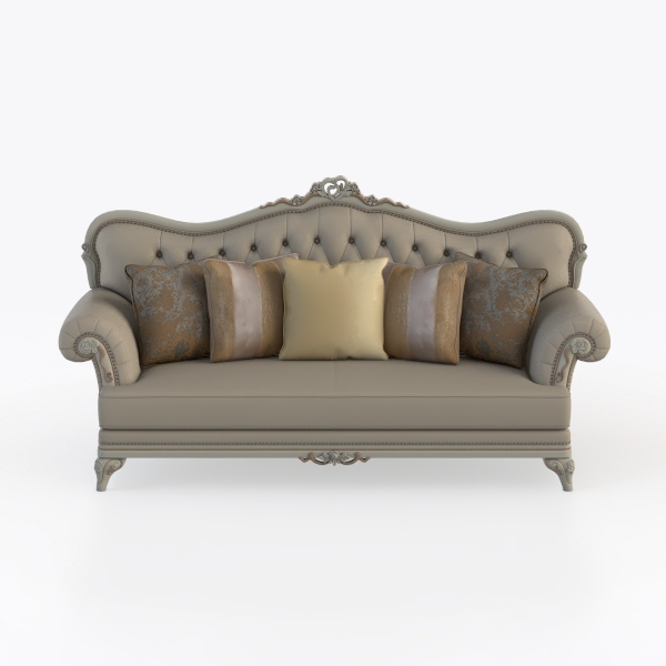 This sofa exudes timeless elegance, drawing inspiration from 18th-century European rococo design, where intricate craftsmanship and soft curves merge to create a piece that feels both historically rooted and modern. Its silhouette is defined by gently sloping armrests, a tufted backrest with subtle diamond patterns, and delicate carved scrollwork along the edges, adding layers of visual interest without overwhelming simplicity.