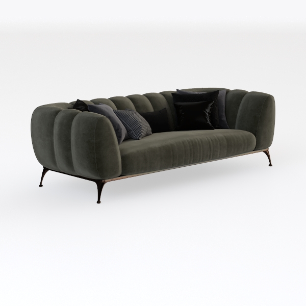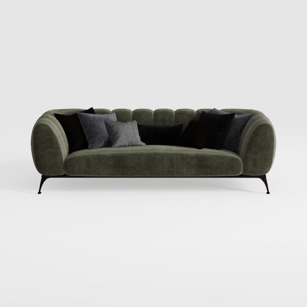 Drawing inspiration from the soft, flowing lines of natural forms—like the gentle curves of seashells or the subtle undulations of cloud drifts—this sofa embodies a harmonious blend of organic warmth and contemporary design. Crafted with a luxuriously textured velvet upholstery in a muted sage green, its surface feels sumptuously soft to the touch, with a slight sheen that catches light to create depth. The sofa’s silhouette is defined by rounded armrests and a gently indented backrest, curving gracefully to cradle the body, while its black metal legs—sleek and angular—add a modern contrast, grounding the piece and elevating its overall presence.