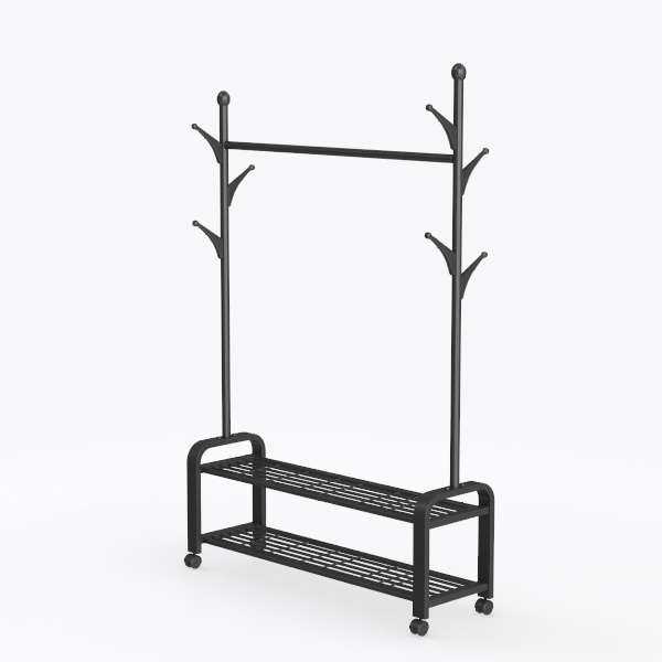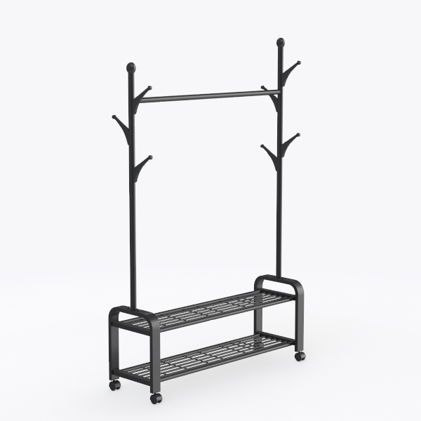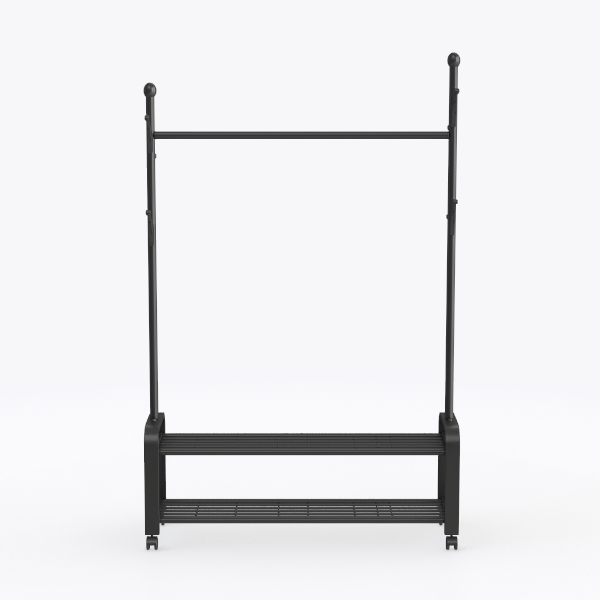 Inspired by minimalist industrial design, this functional garment rack features a sleek black metal frame with clean lines and matte finish. Its smooth, cool metal surface contrasts with structural sturdiness, creating a modern, uncluttered aesthetic. Ideal for modern, Scandinavian, or industrial bedrooms and walk-in closets, it pairs with wooden floors and neutral walls. Lower shelves hold shoes or folded items, while smooth-rolling casters allow easy rearrangement.